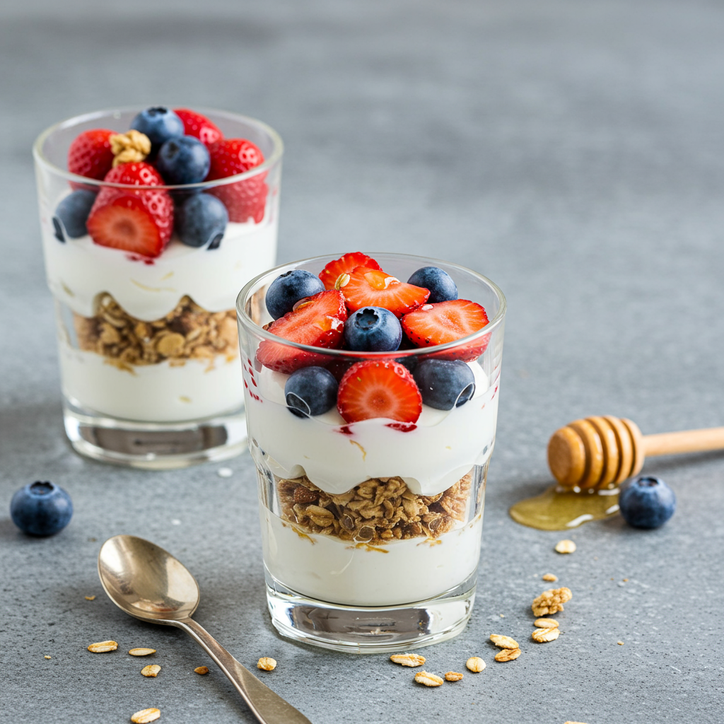 - Coloque capas de yogur, bayas y granola en un vaso.
